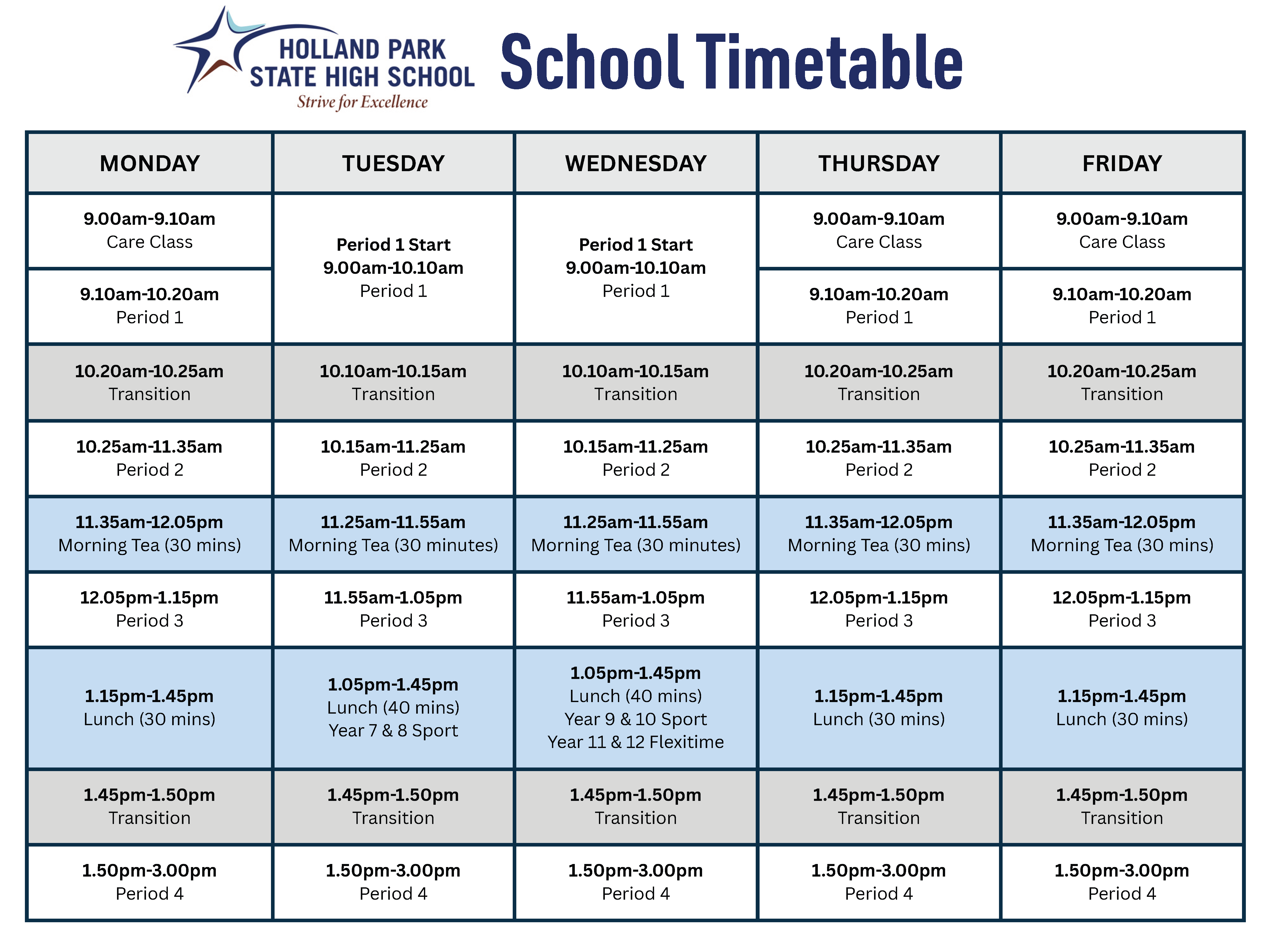 Every school day begins at 9:00am, and concludes at 3:00pm.