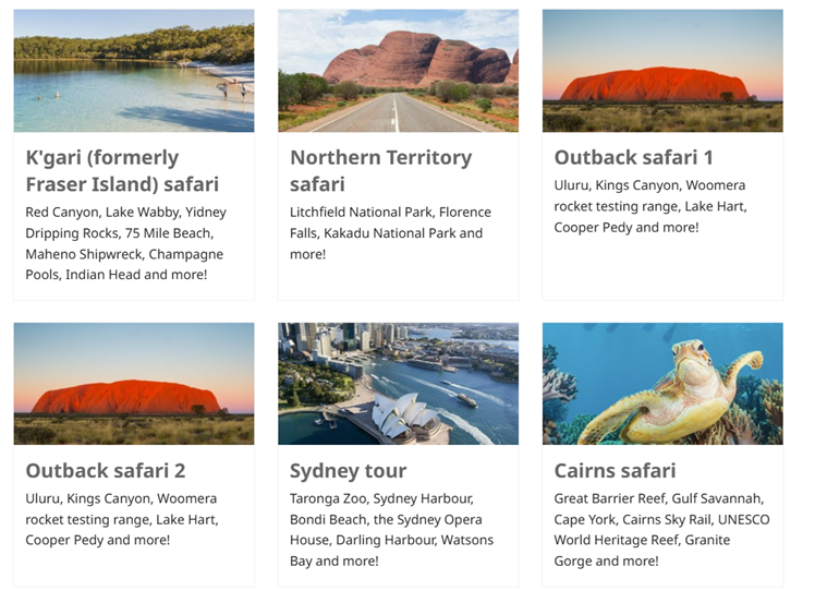 From snorkelling on the Great Barrier Reef and cuddling a koala in Cairns, to discovering Sydney's world-famous landmarks—including the Blue Mountains and Bondi Beach—students can experience Australia's natural beauty and vibrant city life. Other tours allow students to explore the underground town of Coober Pedy, witness the majesty of Uluru at sunset, or journey through the stunning regions of Central and Northern Australia. The East Coast and Southern Safaris offer an incredible adventure along Australia's eastern coastline, featuring visits to Sydney, Melbourne, Canberra and many picturesque destinations in between.